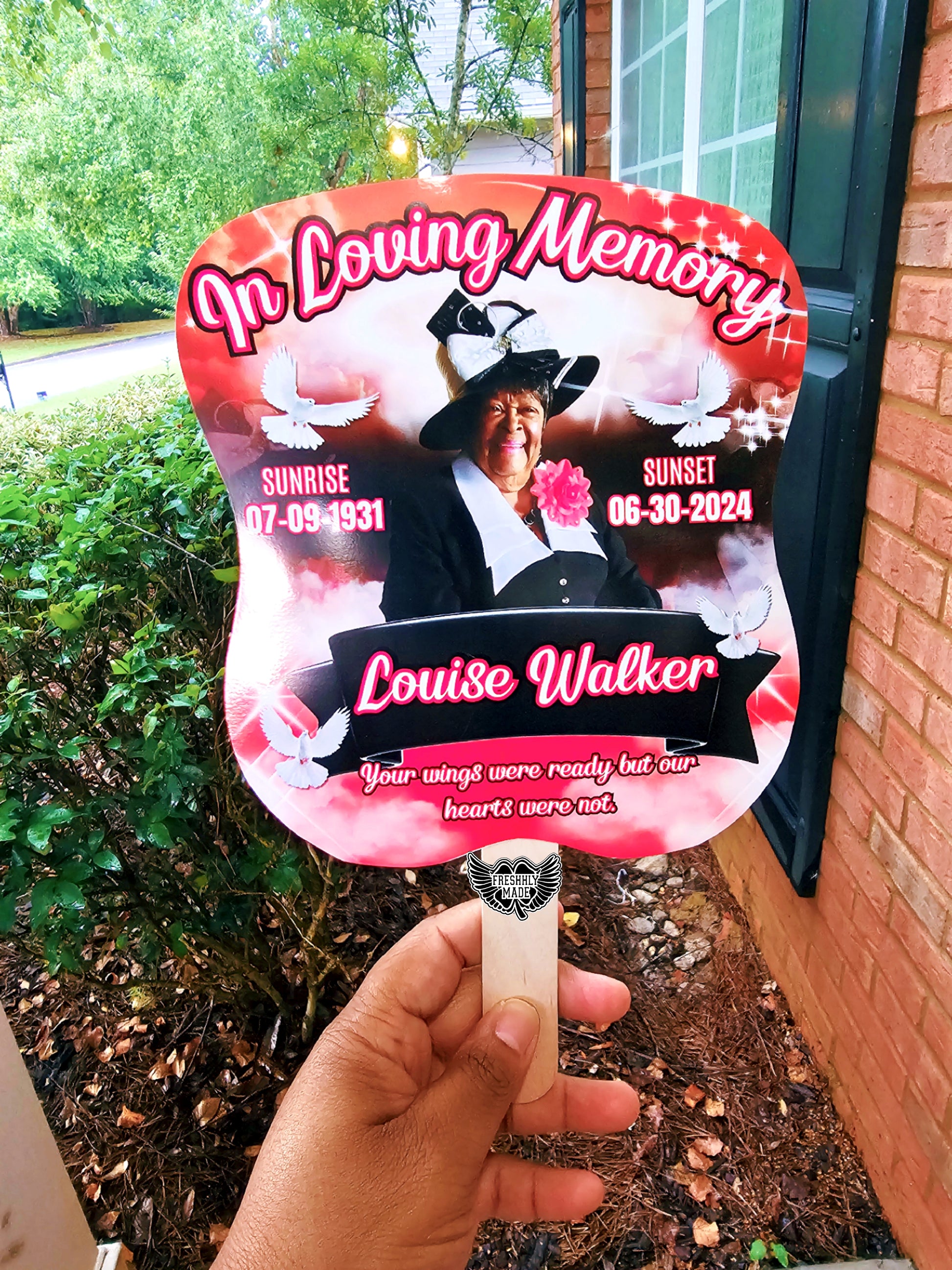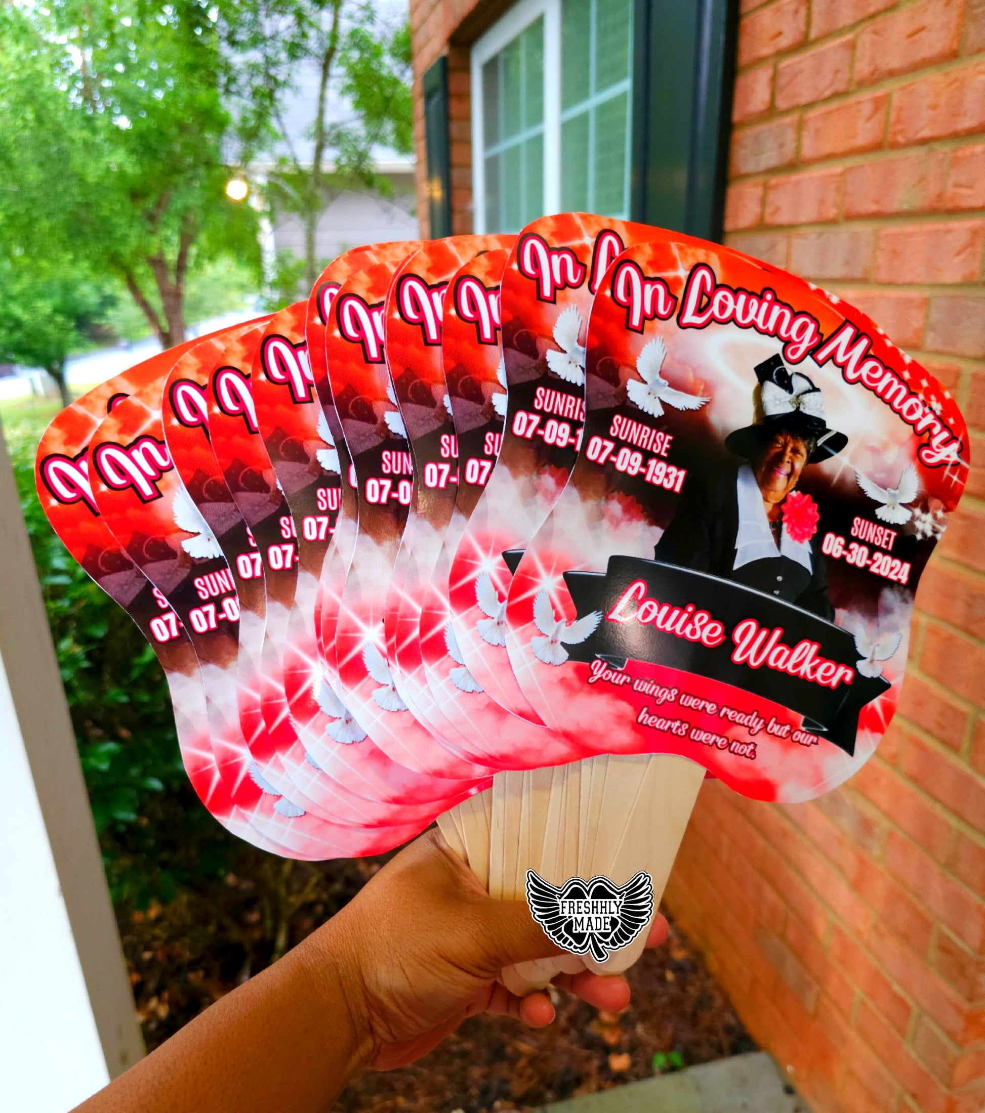 Celebrate the life of your beloved with our beautifully crafted memorial fans. Each fan features a picture of your departed loved one, allowing you to hold their memory close during special occasions. Our fans are designed with care and precision, ensuring a lasting tribute to those who have left an indelible mark on your heart. Minimum order quantity is 5 fans, perfect for sharing with family and friends.